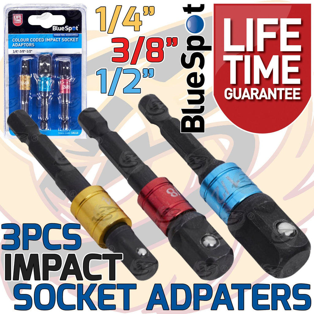 - 3PCS COLOUR CODED DRILL SOCKET ADAPTER SET 1/4"DRIVE - 3/8"DRIVE - 1/2"DRIVE
