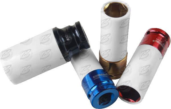 SUITABLE FOR BOTH, MANUAL AND IMPACT WRENCHES. SOCKETS HAVE PLASTIC COVERS FOR PROTECTION OF ALUMINIUM RIMS.