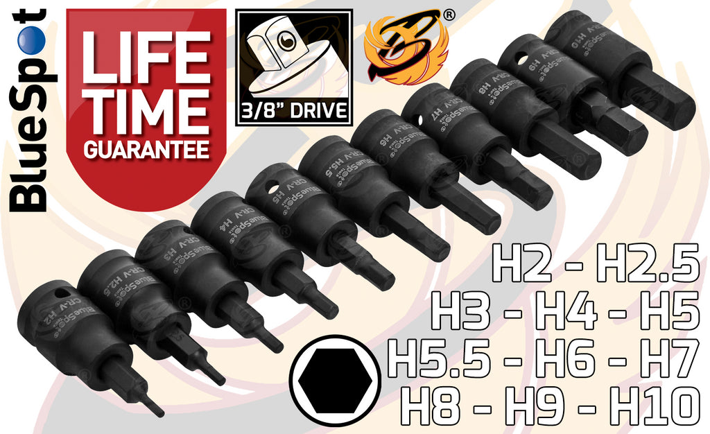 - The Blue Spot Tools 11 PCE 3/8" impact hex bit sockets (H2-H10) are designed for use with 3/8" drive hand power and air tools.