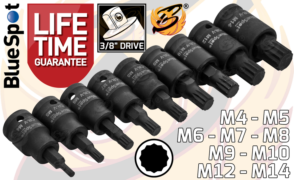 - The Blue Spot Tools 16 PCE 3/8" impact spline bit sockets are designed for use with 3/8" drive hand power and air tools.