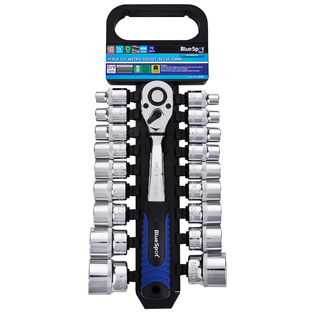 The Blue Spot Tools 19 PCE 1/2" metric socket set (8-32mm) is manufactured from chrome vanadium for increased durability. The set is heat-treated and fully polished. Includes a 1/2" drive ratchet with 72 Teeth and sturdy holder for convenient storage and transportation.
