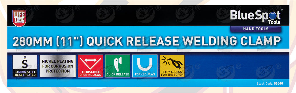 The Blue Spot 280mm (11") quick release welding clamp is manufactured from heat treated carbon steel for increased durability, with a nickel plating to prevent against corrosion. They have adjustable opening jaws and a quick release lever. Unique forked jaws give you better visibility and also allows easier access for the torch.