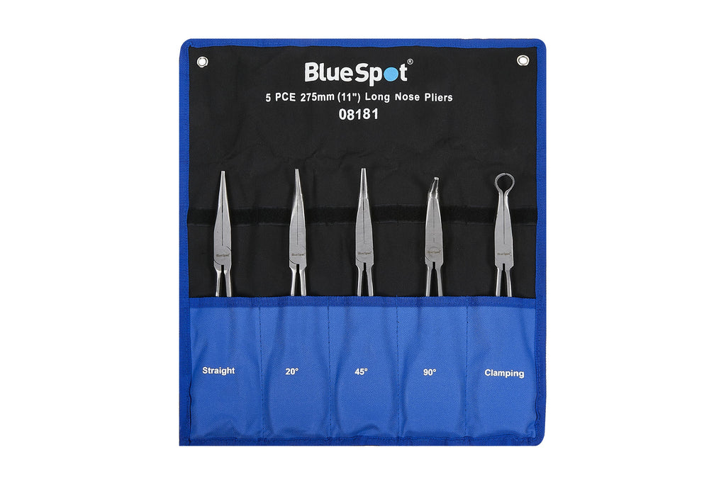 The Blue Spot Tools 5 PCE 275mm (11") Long Nose Pliers are manufactured from chrome vanadium steel for increased durability. Soft-grip handles for increased comfort. Set includes straight, 20°, 45°, 90°, clamping plier. 13mm hole diameter. Supplied in wallet.