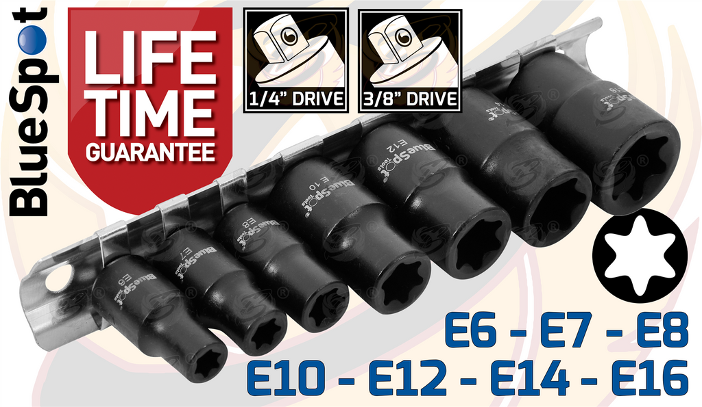 The Bluespot 7pce 1/4"-3/8" Impact E Torx Sockets are manufactured from Chrome Vanadium for increased durability with a black phosphate coating to help against corrosion. The set comprises common sizes in 1/4" and 3/8" drive supplied on a handy socket rail for storage making them easy to find in any toolbox. Ideal for use with impact tools.
