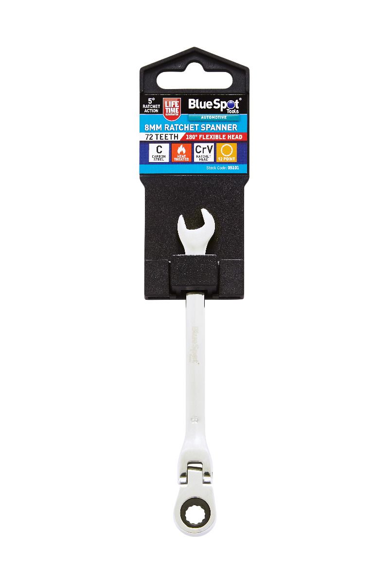 • The Blue Spot Tools Flexible Ratchet Spanners feature 180° pivoting ratchet ring heads. Manufactured from carbon steel with a chrome vanadium ratchet head, heat-treated and nickel-plated for increased durability. 5° ratcheting increments make set ideal for use in tight spaces. Fully polished mirror finish.