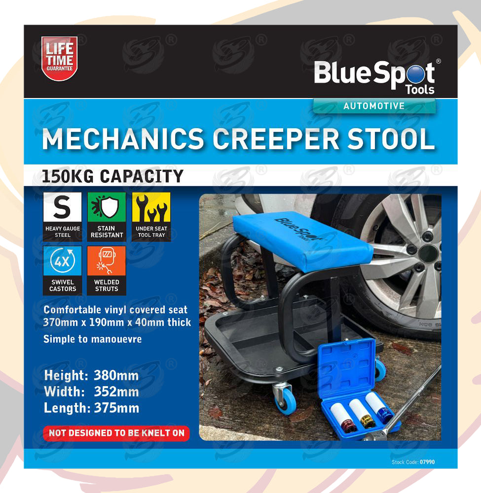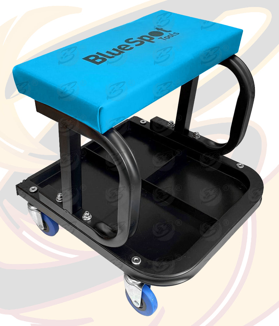 THE BLUESPOT MECHANICS CREEPER STOOL IS MANUFACTURED FROM HEAVY GAUGE STEEL WITH WELDED SUPPORT STRUTS FOR INCREASED DURABILITY. THIS STOOL HAS A 150KG WEIGHT CAPACITY AND IS CAPABLE OF WITHSTANDING HOURS OF USE AT ANY ONE TIME, DUE TO ITS COMFORTABLE 370MM X 190MM VINYL COVERED STAIN RESISTANT 40MM THICK PADDED SEAT, WHICH AIDS USER COMFORT.