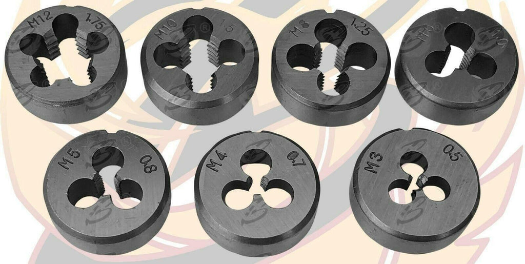 - M3 x 0.5 - M4 x 0.7 - M5 x 0.8 - M6 x 1.0 - M8 x 1.25 - M12 x 1.75