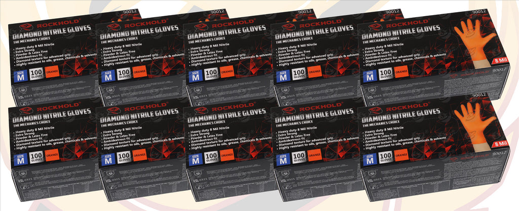 - ROCKHOLD HEAVY DUTY 8MIL DIAMOND GRIP NITRILE GLOVES ( ORANGE )