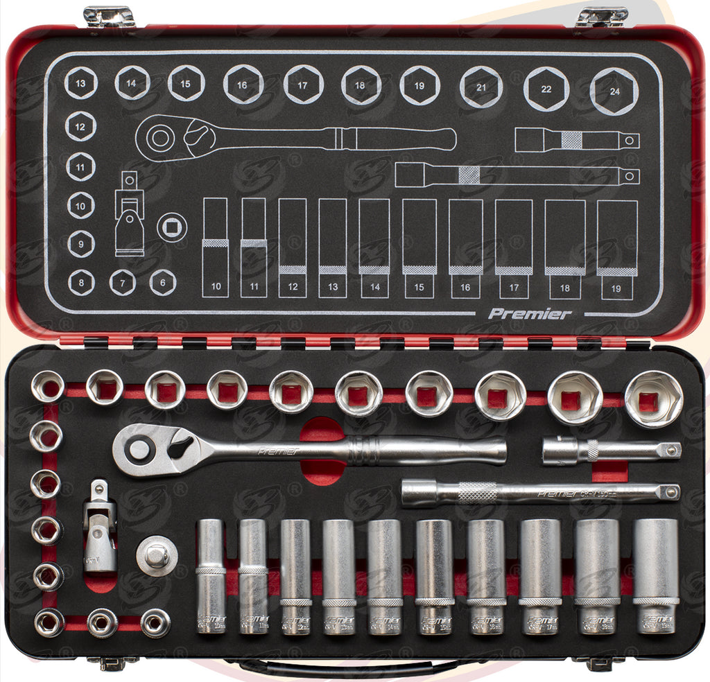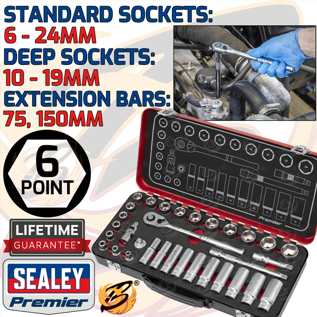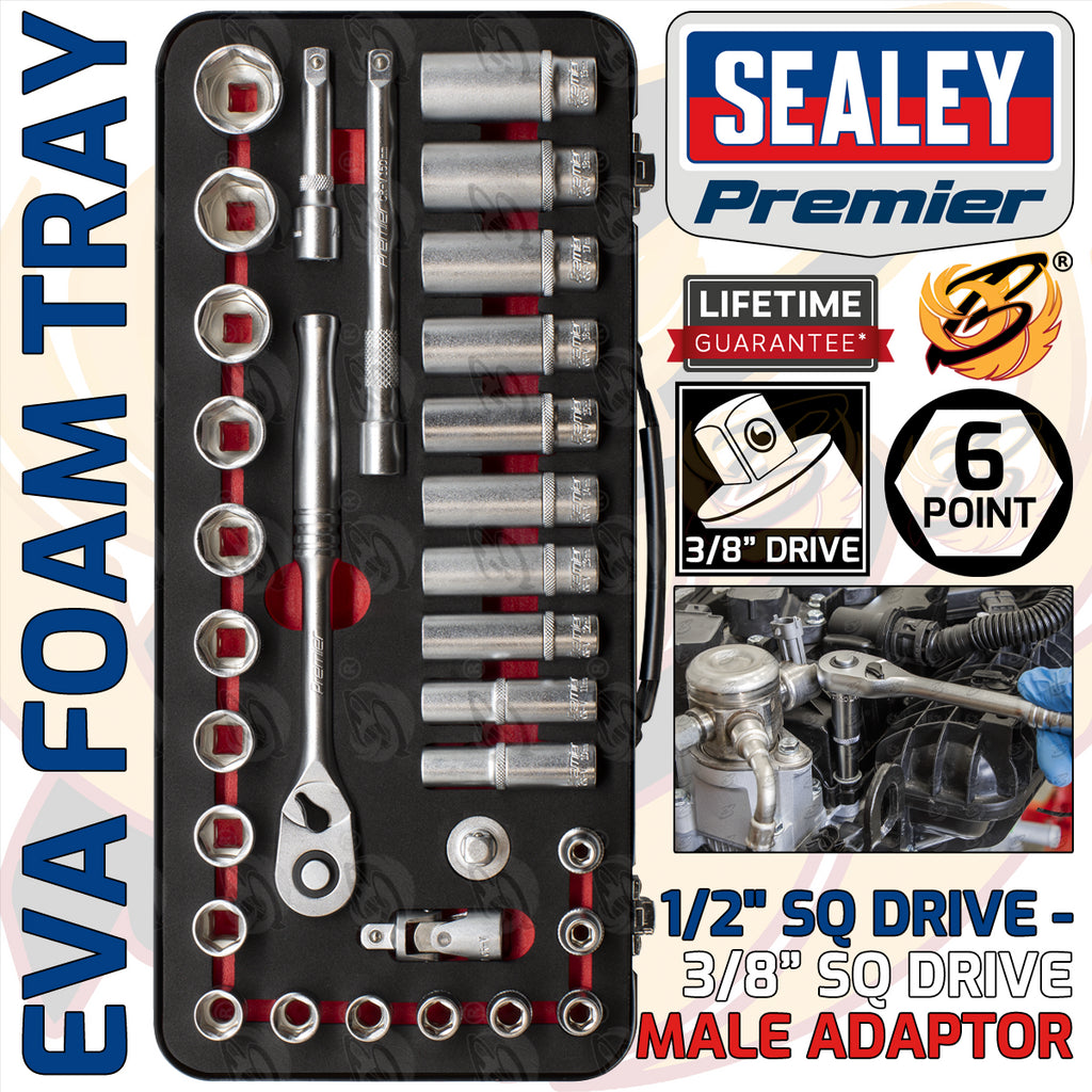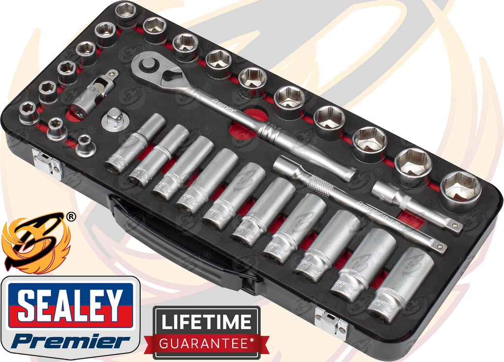 SEALEY 32PCS 3/8" DRIVE 6 POINT 90 TOOTH PREMIER PLATINUM SOCKET SET 6MM - 24MM