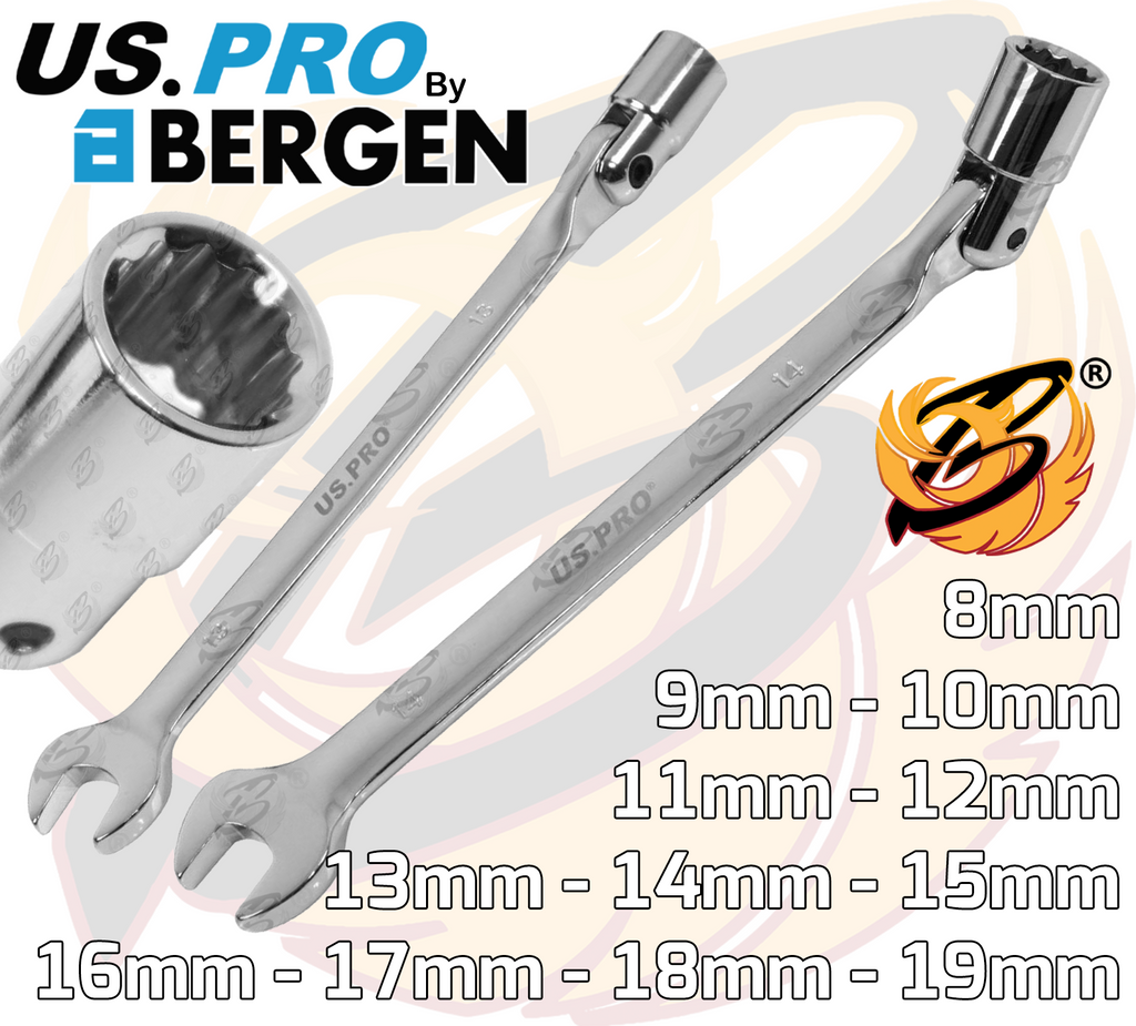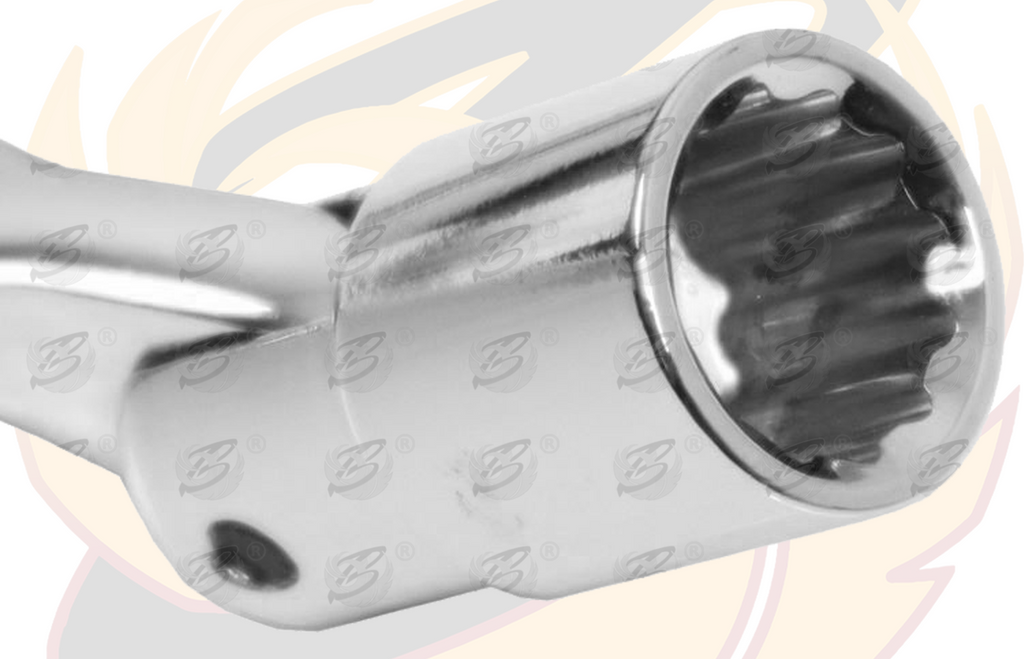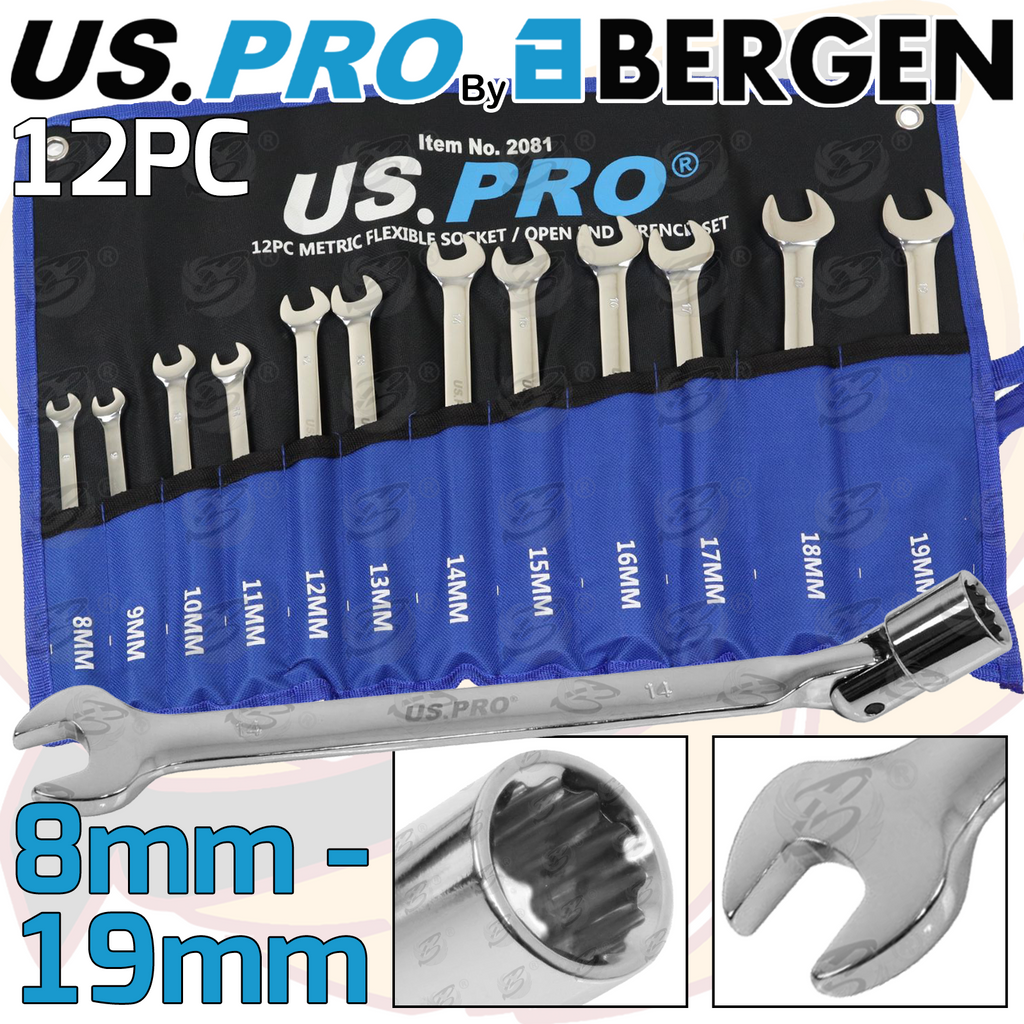 - Set of 12 metric spanner, open at one end and a flexible socket on the other.