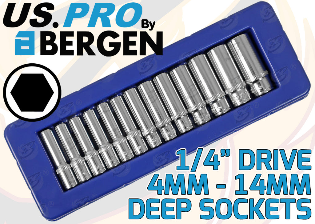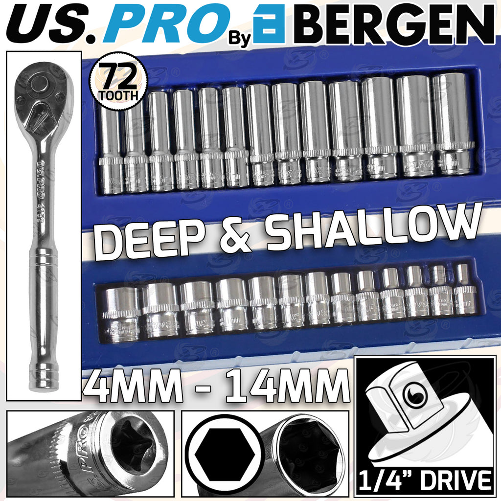 - US PRO 27PCS 1/4" DRIVE 6 POINT DEEP & SHALLOW SOCKETS 4MM - 14MM & RATCHET HANDLE