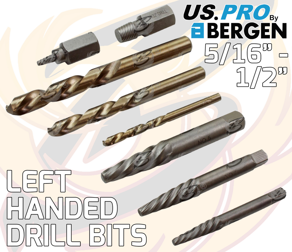 16 anti clockwise HSS Drill Bits: 5/64″, 7/64″, 1/8″, 5/32″, 3/16″, 7/32″, 1/4″, 9/32″, 19/64″, 5/16″, 11/32″, 3/8″, 13/32″, 7/16″, 15/32″, 1/2″