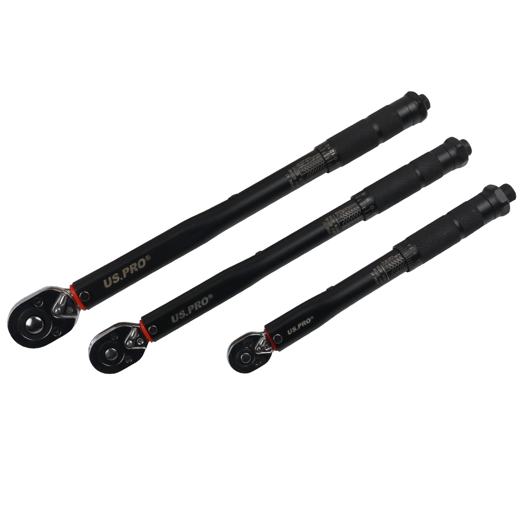 A three piece set of calibrated torque wrenches with hard wearing Chromium Molybdenum steel drive gear. 1/4", 3/8" and 1/2" drives are included all with dual scale (NM & FT-LB).