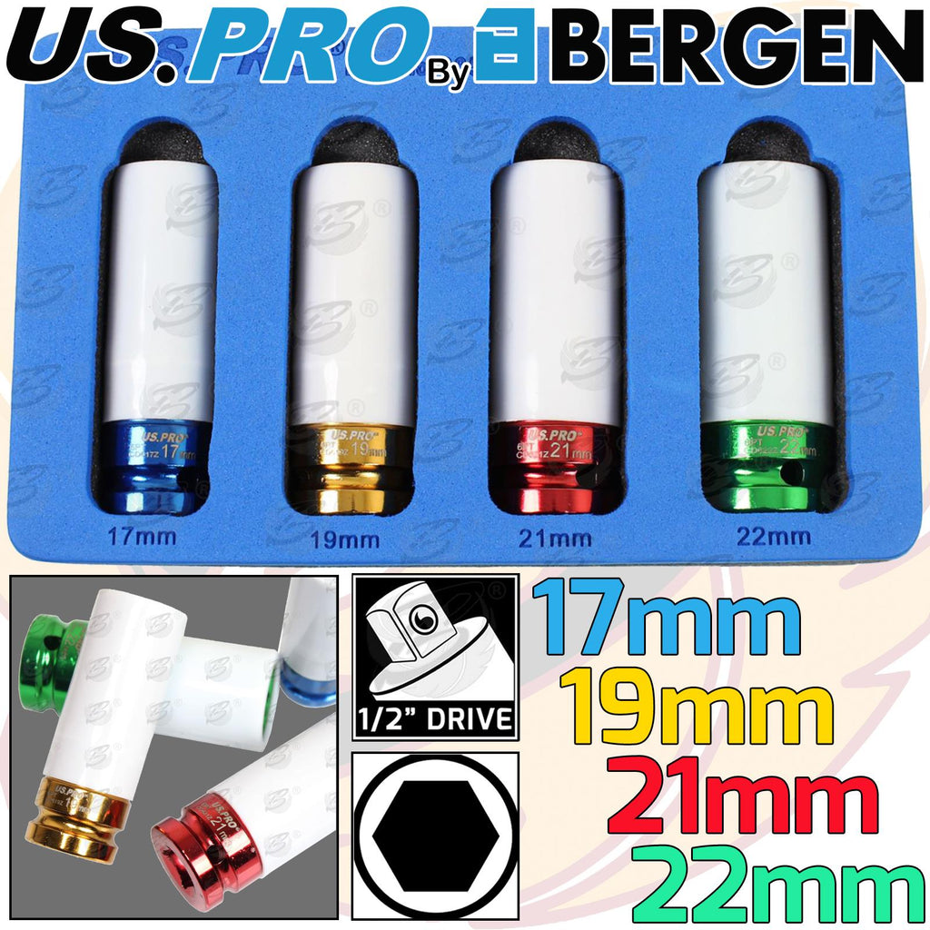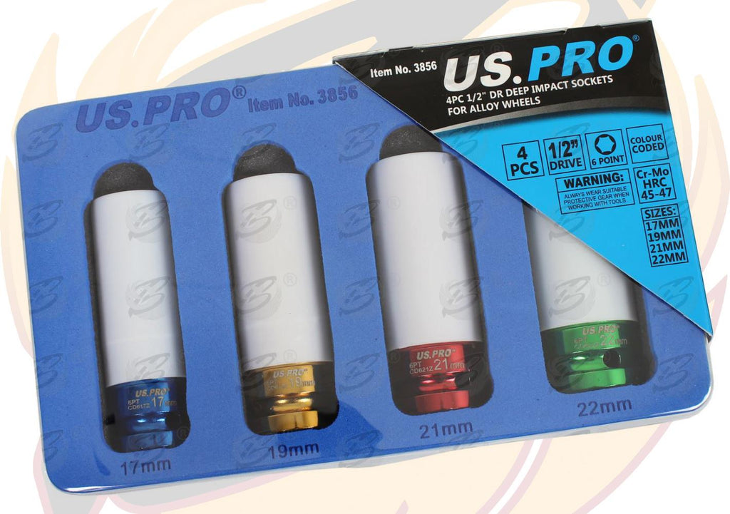 US PRO 4PCS 1/2" DRIVE 6 POINT ALLOY WHEEL NUT SOCKETS ( 15MM - 22MM )
